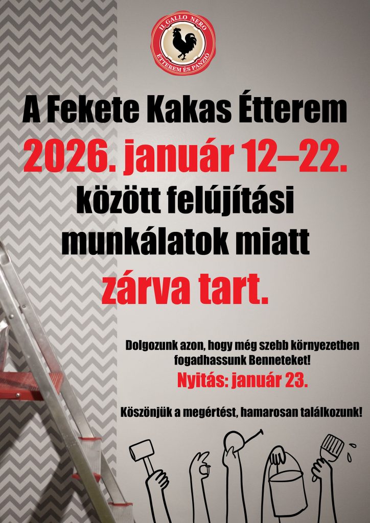 Éttermünk felújítás miatt január 12-22. között zárva tart!